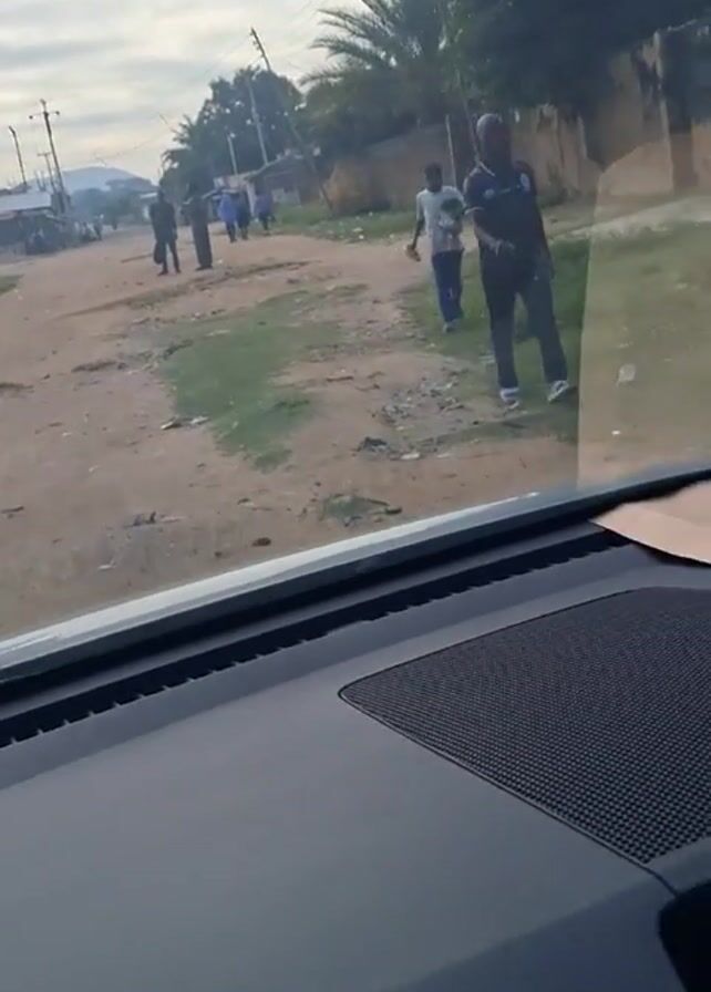 From inside a vehicle, the camera looks out onto a dusty, cracked, dirt road. Several people walk, talk, or stand on the road. Power lines run along the road. Some buildings are visible in the distance. Vegetation is sparsely scattered around the road and along the sides. A palm tree is present on the right side. The sky is overcast. The vehicle's dashboard is in the foreground.