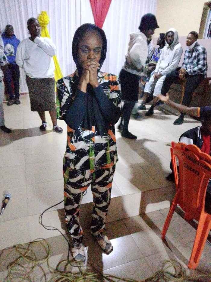 A person stands with hands clasped near the chin in a room with several other individuals in the background. The person wears a patterned jumpsuit and a dark head covering. A microphone and tangled wire are visible on the tiled floor. Other people are seated or standing on a raised platform behind them. Curtains are partially visible in the background. An orange chair is to the right.