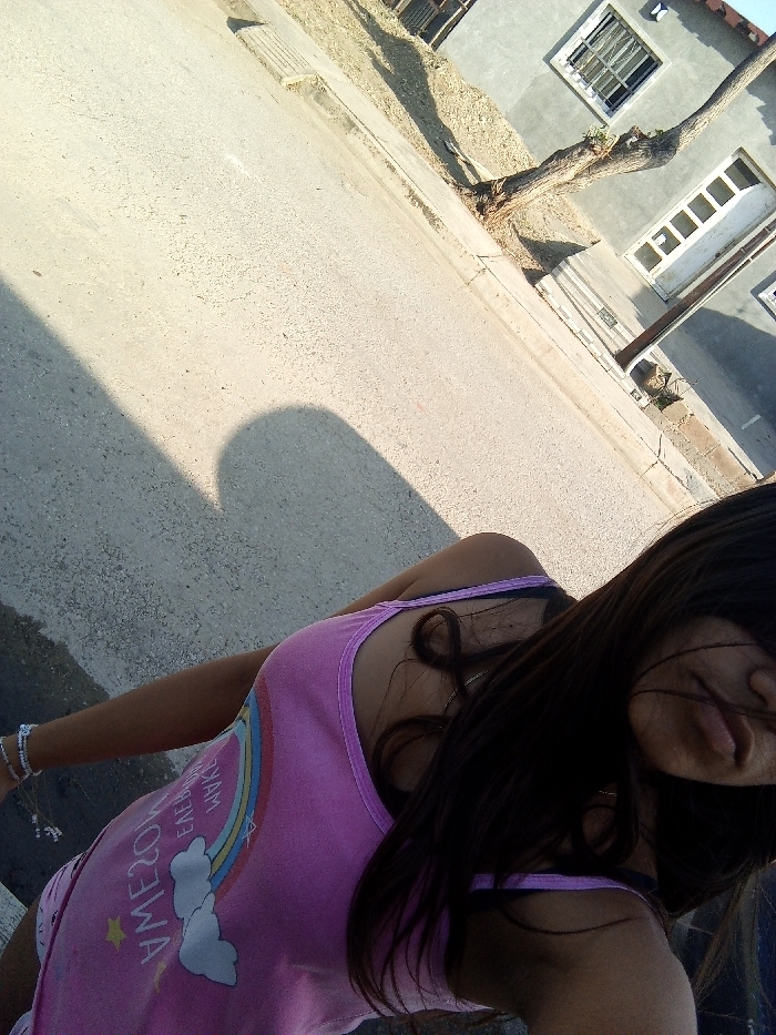 A girl with long, dark hair poses outdoors, wearing a pink tank top with a rainbow and clouds design. She holds her arm out, displaying a beaded bracelet. The background features a street with a building to the side, with distinct windows and a tree trunk jutting out. A prominent shadow of a head and arm is cast on the pavement. The image is taken at an angle, providing an unconventional perspective.