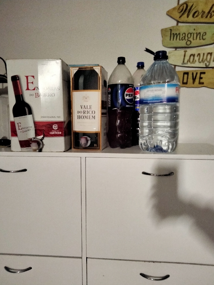 The image depicts a shelf with various items. On the left, there's a box labeled "Enostas do Barro" featuring a wine bottle image, and another box titled "Vale do Rico Homem" indicating a 3L volume. Next to them are a Pepsi bottle, another unidentified blue-labeled bottle, and a large water bottle with a black cap. In the background, a wooden sign displaying words like "Work," "Imagine," "Laugh," and "Love" can be seen. The shelf itself appears to be part of a white cabinet with metal handles.