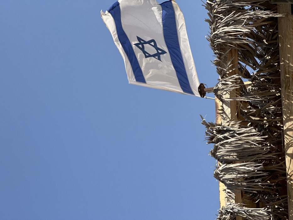 - "A white Israeli flag, featuring two horizontal blue stripes and a central blue Star of David, is depicted flying against a clear, cloudless blue sky under direct sunlight" by FM-RIphO2, licensed under CC BY 4.0