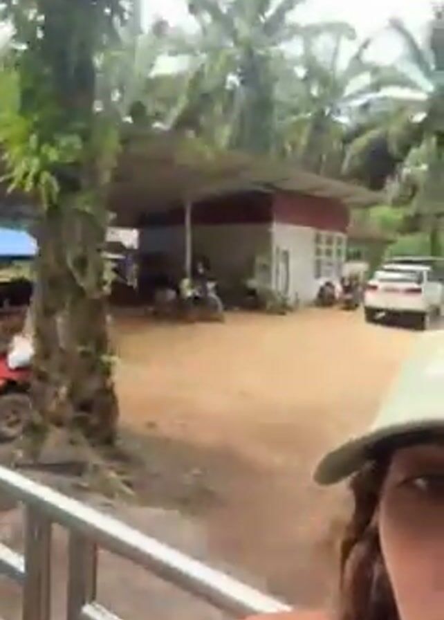 A woman is filming a video while standing near a metal railing. In the background, there's a dirt lot where several ATVs are being ridden around. There are palm trees surrounding the area, and there are several cars and trucks parked nearby. Some of the ATVs are red. There's a covered area with more ATVs parked under it in the back left. The weather appears to be overcast or rainy. The woman filming is wearing a light-colored hat.