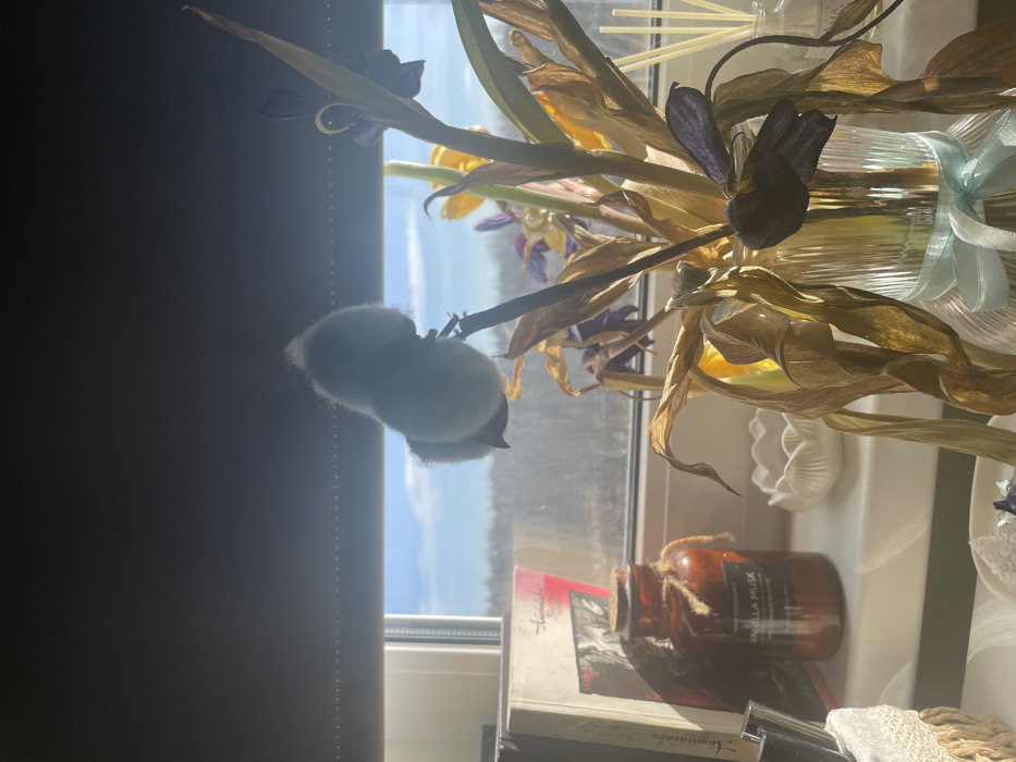 The image depicts an indoor scene focused on a windowsill or shelf, illuminated by bright natural sunlight entering through a window. The setting is located in the city of Saint Petersburg, Russia. In the foreground and midground, a clear glass vase, adorned with a light blue ribbon, holds a display of dried or wilting flowers, primarily yellow-brown leaves and petals, with some dark purple remnants resembling irises or tulips. Perched precariously on one of the dried stems within the vase is a small, white, fluffy object, resembling a chick or a decorative cotton bird. To the left of the vase, a dark brown glass jar, secured with a cork stopper and twine, is visible. Its label reads "HOME FRAGRANCE VANILLA MUSK." Behind this jar, a light-colored book, partially obscured, shows the title "Arunachalaba." A second book is partially visible behind the first. Further to the right of the fragrance jar, a small, white, lotus-shaped ceramic dish is present. A small white plate containing several small, dark, irregular objects is also visible. On the far right, a reed diffuser bottle with white reeds is partially visible. A light-colored woven basket or container is partially visible on the far left. The background, seen through the window, reveals a bright blue sky with scattered white clouds. Below the sky, a distant, horizontal line of bare trees or vegetation indicates an undeveloped outdoor landscape. A dark gray or black roller blind is partially lowered at the top of the window frame, casting a shadow into the room. Strong natural light creates distinct shadows from the objects on the windowsill. No human figures are present in the scene.