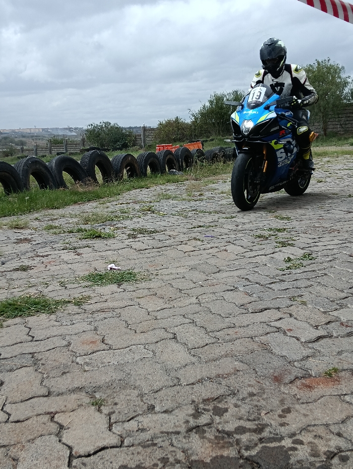n individual operating a blue and black Suzuki GSX-R sportbike on a paved surface in Matathani ward, Kenya. The rider is clad in a white, black, and yellow full-body racing suit, a black helmet with a dark visor, and black gloves. The motorcycle bears the number "13" on its front and features gold-colored accents. The ground consists of grey interlocking concrete pavers, interspersed with patches of grass and dark, wet-looking stains. To the left, a linear barrier of black car tires is partially embedded in a grassy area, with additional orange barriers visible further back. Green bushes and trees are present in the mid-ground. The distant background reveals faint outlines of buildings and structures under a uniformly overcast sky. A red and white striped object is partially visible in the upper right quadrant of the image.