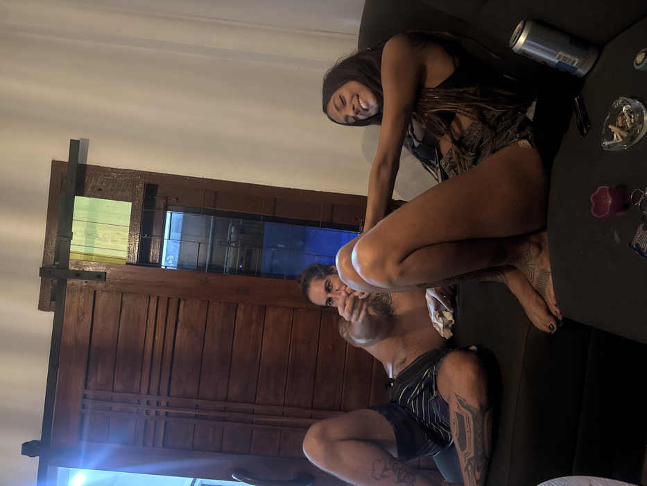 A tanned woman with long, dark hair sits on a black sofa, smiling. Next to her is a can and an ashtray. A man, partially visible, sits below her, covering his mouth with one hand. He wears striped shorts, and tattoos are visible on his legs. Behind them, there's a wooden door with colored glass panels at the top. The room is brightly lit.