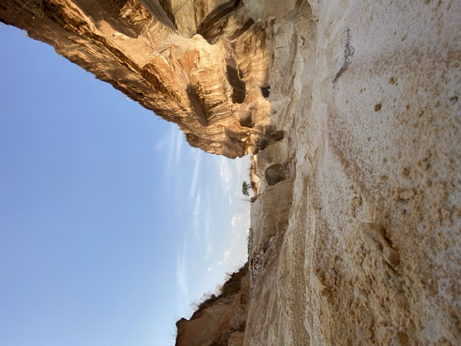 An upward-angled shot reveals towering cliffs against a clear blue sky. The left cliff face is layered with tan and brown striations, forming caves and protrusions. The right cliff appears porous and textured, showcasing a sandy color. A small tree grows precariously on the exposed edge between the cliffs. The sky is bright, with soft wisps of clouds visible between the rock formations.