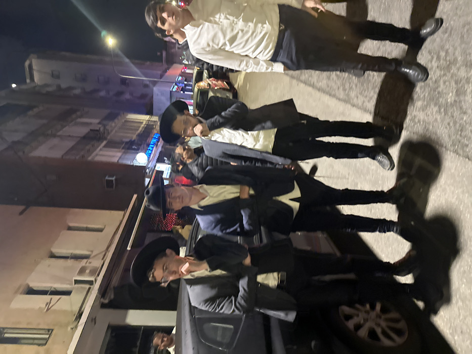 The image displays an urban street scene at night in Ramat Gan, Israel. Four males, appearing to be young adults, are positioned on a paved sidewalk in the foreground. From left to right: 1. A male in a dark suit jacket, light shirt, dark pants, and a dark fedora-style hat, wearing glasses. His left hand is raised to his chin. He is leaning against the fender of a dark-colored sedan parked at the curb. 2. A male in a dark jacket, light shirt, dark pants, and a dark fedora-style hat. His arms are crossed over his chest. 3. A male in a dark suit jacket, light shirt, dark pants, and a dark fedora-style hat. Visible peyot (sidelocks) and a beard are present. His right hand is raised to his chin/mouth area. 4. A male in a white long-sleeved button-up shirt and dark pants. His hands are near his sides or in his pockets. The background features several multi-story buildings lining the street, illuminated by artificial lighting. One building on the left exhibits multiple windows and external air conditioning units. Further down the street, commercial establishments are indicated by illuminated signs, one of which displays blue Hebrew text. Other individuals are partially visible in the mid-ground, and additional vehicles are parked along the street. The sky is dark, consistent with nighttime.