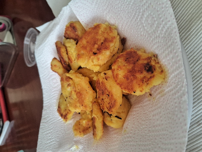 - "A close-up image captures a pile of approximately 15-20 irregularly shaped, golden-brown fried food items, possibly potato fritters, resting on two sheets of white, textured paper towels" by FM-UrRWw2, licensed under CC BY 4.0