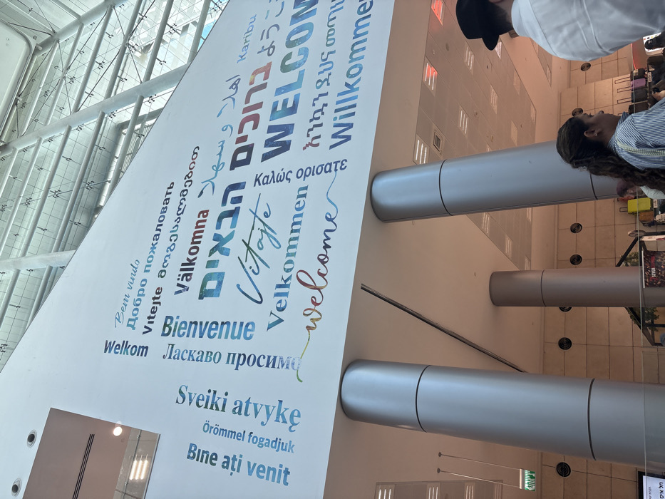 The image depicts the interior of a modern public building, consistent with a major transportation hub or convention center such as Jerusalem's Yitzhak Navon Railway Station, located in West Jerusalem, Israel. A large, white, rectangular sign prominently displays the word "WELCOME" in approximately 18 different languages, including Hebrew (ברוכים הבאים), Arabic (أهلاً وسهلاً), English, Russian (Добро пожаловать), French (Bienvenue), German (Willkommen), Swedish (Välkomna), Portuguese (Bem vindo), Amharic, and Japanese (ようこそ). This sign is affixed to a high, white ceiling which incorporates recessed lighting and a skylight-like structure composed of metal beams and glass panels, allowing natural light into the space. Several large, silver-gray, cylindrical pillars, tapering slightly, rise from the floor to support the overhead structure. A green "EXIT" sign, featuring Hebrew text (יציאה), is visible on a wall section to the far left. In the lower right foreground, the back of a male individual wearing a white shirt and a black fedora hat is visible. Immediately to his left, a female individual with long, dark, curly hair tied back is observed in profile, facing right, dressed in a light-colored striped shirt. Other indistinct figures are partially visible in the background among what appear to be various objects, possibly luggage or commercial displays. The overall scene is brightly lit and indicates a spacious, contemporary public area designed for movement and transit.