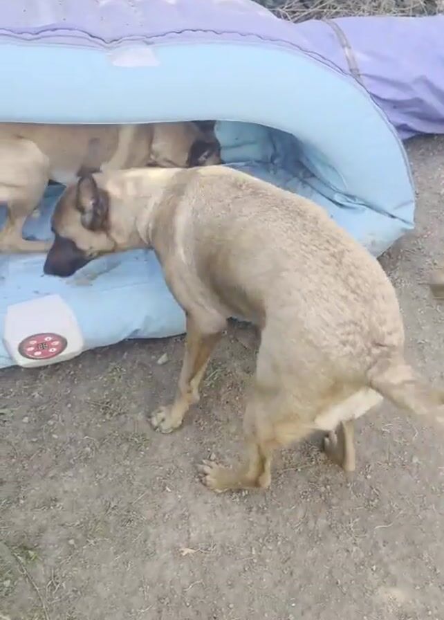 dog exiting a light blue inflatable structure while another dog watches. The first dog is primarily tan with a dark muzzle and back. It steps out of the structure, then runs away from the camera. The second dog is similar in color but has darker markings on its face and back. The inflatable structure appears to be some kind of pool or bed with a curved top. The dogs are on a dirt and grass surface, with some greenery in the background.