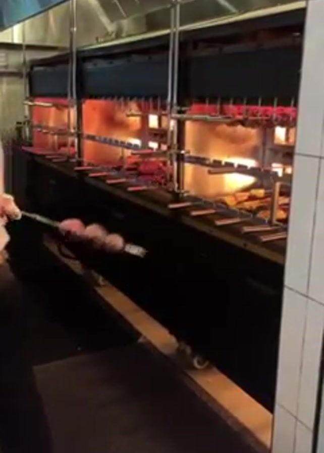 A well-lit commercial kitchen showcases a large, rotating grill. The grill has multiple tiers with skewers rotating horizontally over a row of glowing red heating elements. A person in a white shirt and black pants stands facing the grill, using a long tool to manipulate the food being cooked. The person makes a large sweeping motion and flips a row of the skewers. A second person wearing similar clothing is partially visible in the background. The kitchen has stainless steel walls and a tiled section visible on the right side of the frame.