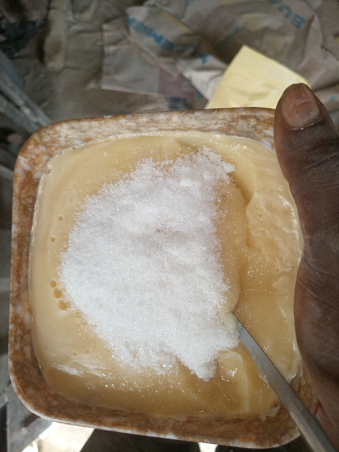 An overhead shot shows a dark-skinned right hand holding a metallic utensil within a square, mottled brown ceramic or plastic container. The container holds a viscous, light yellow-brown substance. A distinct pile of white granular material, consistent with sugar, rests on the surface of this substance, predominantly in the left half of the container. The metallic utensil, possibly a spoon or small knife, is partially submerged in the substance on the right side, adjacent to the thumb. In the blurred background, a yellow block, likely butter, wrapped in light-colored paper with blue text, is visible to the upper right. Further back, out-of-focus crumpled bags or packaging with faint blue printing can be discerned. The scene is located in Unknown, Unknown, consistent with an indoor setting, possibly a kitchen or food preparation area.