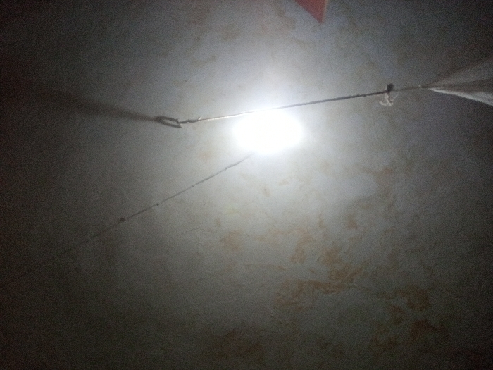 The image depicts a dim room, possibly a bedroom. A bright light source is centrally positioned near the ceiling, casting stark shadows across the textured surface. A thin wire or string stretches horizontally, anchored on either side by hooks. The wire appears to support something, possibly a mosquito net partially visible on the right. The overall ambiance is subdued and somewhat unclear due to the low lighting.