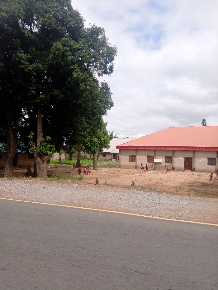The image depicts a roadside scene in Sobon-Gida, Nigeria. In the foreground, a dark grey asphalt road occupies the lower portion of the frame, featuring a single yellow dividing line along its right edge. Adjacent to the road is a grey gravel shoulder. Beyond the gravel, a large, unpaved dirt area extends towards the background. This area contains multiple mature trees with dense green foliage and thick trunks. Beneath one of these trees on the left, an individual is seated on the ground. Scattered across the dirt area are approximately ten children, primarily dressed in red or maroon shirts and dark lower garments. They are engaged in various movements, consistent with running and walking, suggesting play or transit. For instance, a group of three children are running towards the right in the midground, while others are dispersed near the trees and buildings. In the background, two single-story buildings are visible. The building on the right has light grey walls and is topped with a prominent orange-red corrugated metal roof. It features several rectangular windows with dark frames and two dark brown doors. A white rectangular sign with blue text is affixed to its facade between two windows. To the left of this building and partially obscured by trees, another single-story building with a lighter-colored roof is visible. The ground cover in the unpaved area is predominantly bare earth with sparse green vegetation. The sky is overcast, showing a mix of white and grey clouds.