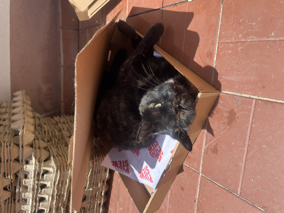 - "A tortoiseshell cat is nestled inside a pizza box" by FM-ZkP5p1, licensed under CC BY 4.0