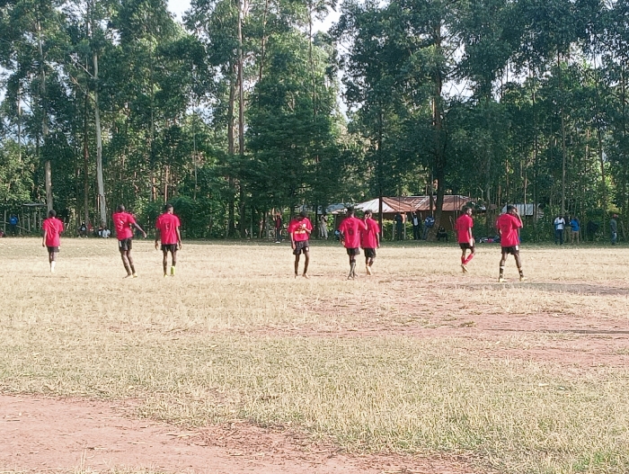A group of soccer players in red jerseys and black shorts are scattered across a grassy field. Behind them, tall trees line the horizon, and a small structure with a rusted roof is visible amidst the trees. A few spectators stand on the sidelines, observing the scene. The field appears dry, and the overall lighting suggests it's daytime.