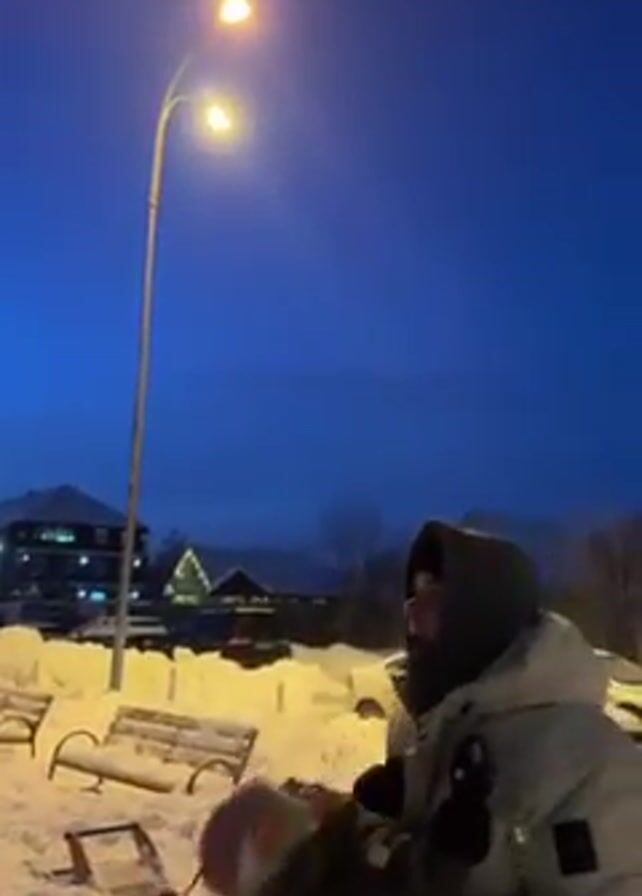 A person in a puffy white jacket with a hood is tossing a child in the air outside on a snowy evening. The child is bundled in a dark jacket and colorful hat. They are in what appears to be a park, with snow-covered benches and a lamppost with two lights. The sky is a deep blue. The person throws the child up in the air repeatedly as the child vocalizes.