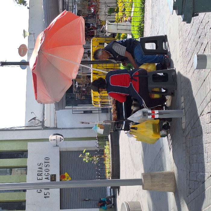 Two vendors sit on plastic stools behind a cart topped with a large, peach-colored umbrella. One vendor wears a striped shirt and jeans, while the other sports a red and blue jacket with black pants. The cart is positioned on a gray stone-tiled walkway next to a building with green trim and a sign reading "GALERIAS 15 DE AGOSTO." A metal pole stands in the foreground, partially obscuring the view of the street.