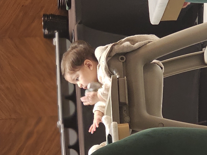 A baby with brown hair sits in a high chair with a grey frame. The baby wears a beige sweater and clutches a small stuffed animal. A beige towel is draped over part of the chair's frame. The background is a blur of dark grey, green, and a wooden floor. Part of the high chair's tray is visible in the upper right corner.