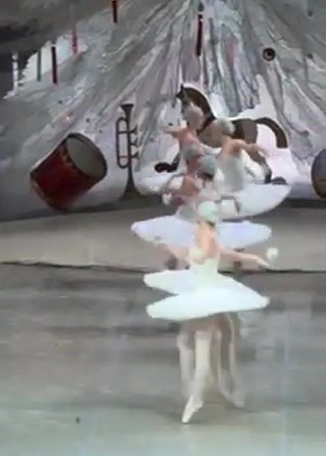 - "The video depicts a ballet performance with a group of ballerinas in white tutus and pale grey wigs dancing on a stage" by FM-GMxhS2, licensed under CC BY 4.0