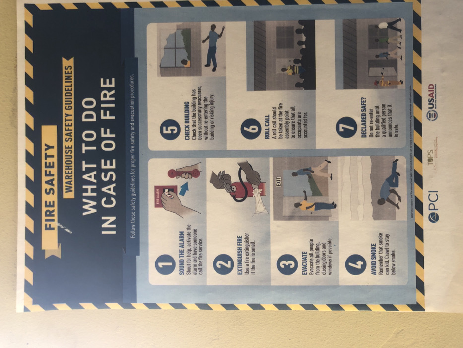 A photograph captures a printed fire safety poster affixed to a light-colored wall in Aviation Quarters, Nigeria. The poster, titled "FIRE SAFETY" and "WAREHOUSE SAFETY GUIDELINES WHAT TO DO IN CASE OF FIRE," features a yellow and black striped border along its top, bottom, and partial sides. It outlines seven numbered steps for emergency procedures, each with a corresponding illustration and textual description. These steps detail: (1) Activating a fire alarm and calling for assistance; (2) Utilizing a fire extinguisher for small fires; (3) Evacuating through designated exits while closing doors and windows; (4) Crawling below smoke levels to avoid inhalation; (5) Verifying building evacuation from the exterior; (6) Conducting a roll call at an assembly point; and (7) Re-entering only after official clearance. The bottom section of the poster displays logos for PCI, TOPS, and USAID. The wall exhibits a uniform, light-toned finish, while the poster itself shows minor surface abrasions, notably in the upper left quadrant.
