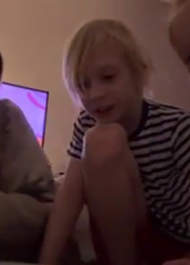 In a dimly lit indoor scene, a woman and two young children are captured in a medium shot, seemingly from a low angle, possibly a bed or floor. The woman, with long brown hair, is wearing a light-colored sweater with a pattern. She rests her head on her hand as she drinks from a clear glass. To her right is a young boy with blonde hair and a striped shirt, kneeling and speaking, apparently reading or explaining something. The other child, a girl with blonde hair, stands beside him, holding a small piece of paper. In the background, a television displays bright, abstract colors. The overall setting is casual and domestic.