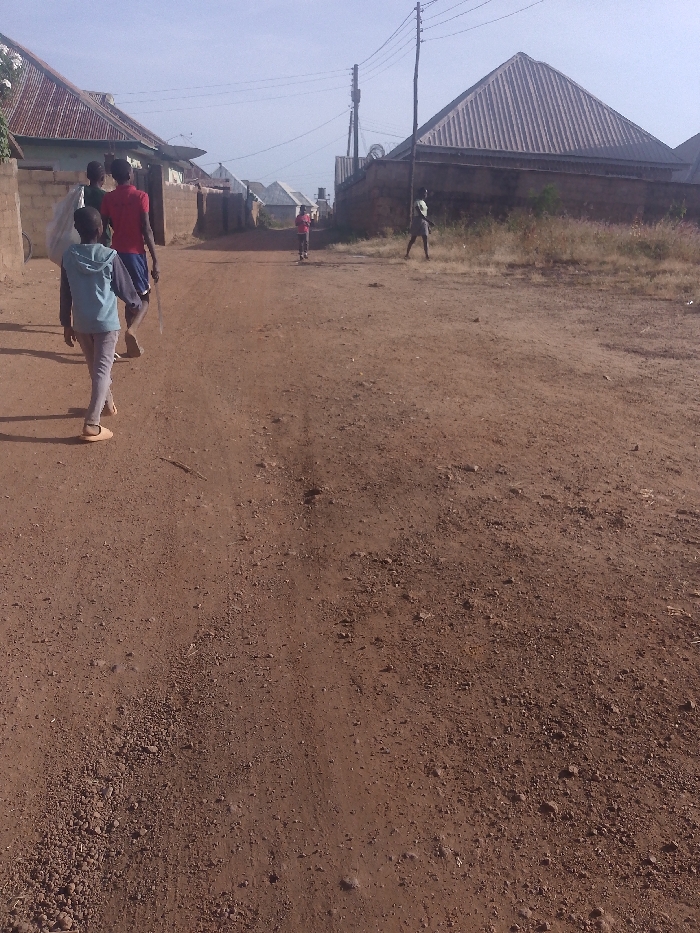 The image depicts a daytime scene on an unpaved, reddish-brown dirt road in Kwang, Nigeria