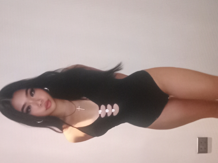 An image depicts a single female subject standing against a plain, light-colored wall in Zango-ndaji, Nigeria. The subject has long, dark, wavy hair and a light complexion, with her gaze directed forward towards the viewer. She is wearing a black, halter-neck, one-piece garment that features three circular cutouts on the upper torso, secured by three white, spherical fasteners. A silver-toned cross pendant is suspended from a dark chain around her neck, and silver-toned hoop earrings are present on both ears. Her lower body and legs are visible to approximately mid-thigh. In the lower-left background, a dark-colored electrical wall outlet with two horizontal socket openings is visible on the wall. The lighting is soft and frontal.