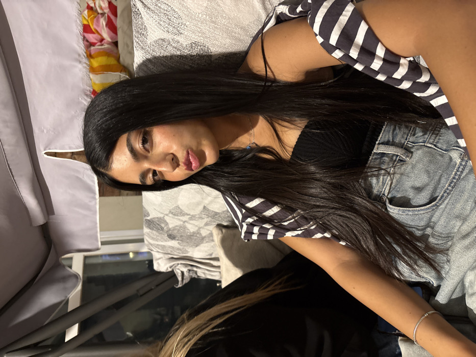 A young female, appearing to be in a residential setting, possibly a covered balcony or patio, is depicted in a posed, chest-up shot. She has long, straight dark hair and is looking directly at the camera with a pouting expression. She wears a black strapless top, light blue denim shorts, and a navy blue and white striped shirt draped open over her shoulders. A thin silver bracelet adorns her left wrist, and a delicate silver necklace with a small blue bead is around her neck. To her immediate left, another individual with light-colored hair is partially visible from the back. The background includes a grey patterned cushion, a colorful striped blanket or cushion, and an overhead grey fabric canopy, possibly from an outdoor swing or pergola. A window or glass door to the left shows a dark, indistinct outdoor environment, consistent with nighttime. The precise location within Ramat Gan, Israel, is not discernible from the visual information provided.
