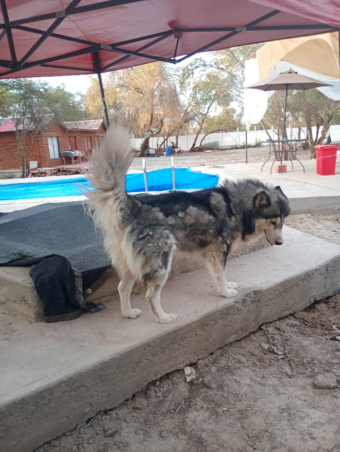 A husky-like dog stands on a concrete platform, its tail upright. A black cloth rests beside it. Behind the dog, a blue pool contrasts with a reddish-brown cabin. Trees sparsely populate the background under a partially visible beige canopy. A red trash can and an umbrella-covered table are also visible in the distance, suggesting an outdoor recreational space. The angle and lighting create a casual, snapshot feel.
