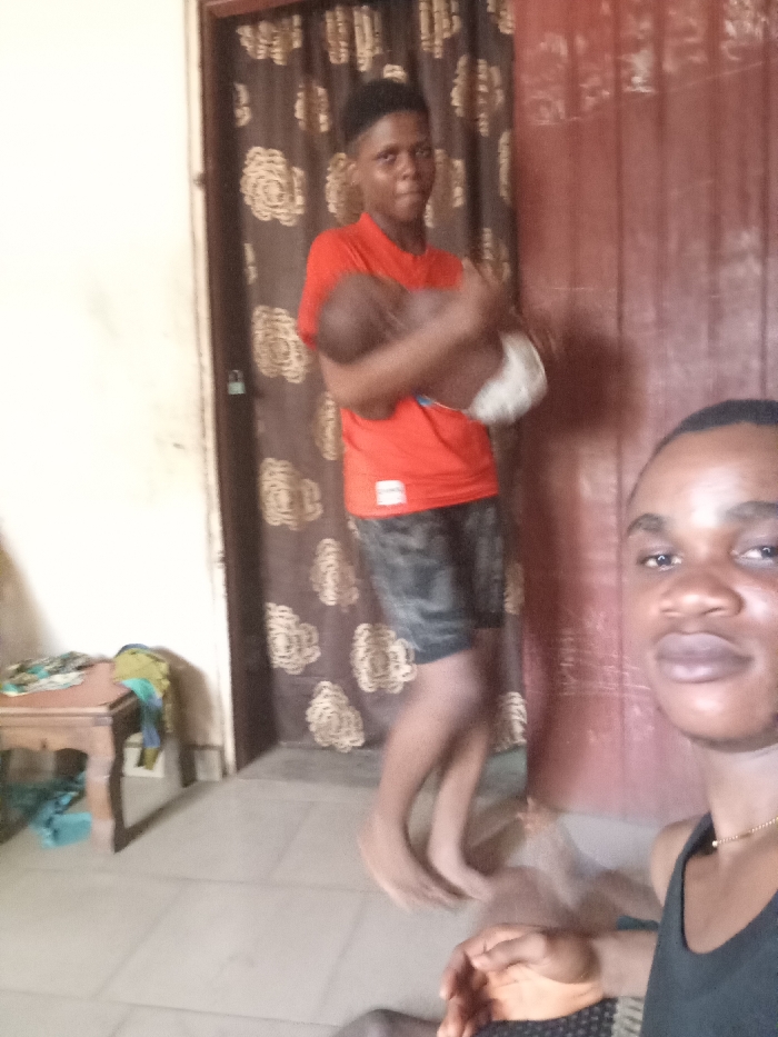 Inside a room with tiled floors, a young man in an orange shirt and black shorts holds a baby wrapped in white cloth. Behind him, a curtain with floral patterns hangs near a red door. Another young man, wearing a black tank top and a thin gold chain, is closer to the camera. A small table with items on it is visible in the background.