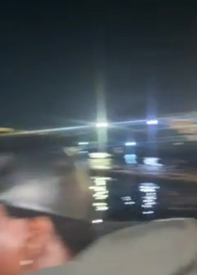 perspective of someone on a small wooden boat at night. The boat appears to be moving through the water. City lights are visible in the distance across the water. At one point, a person wearing a life jacket is partially visible in the frame. The last few seconds of the video show a dark, seemingly flat, area.