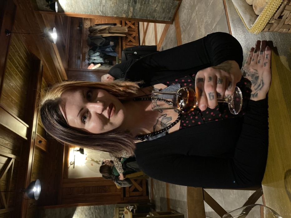 A fair-skinned woman with dyed brown and blonde hair is indoors holding a glass with a golden liquid. She wears a black top over a red polka-dot shirt and a black beaded necklace. Her hands are tattooed. Other patrons are in the background, and the interior features wood paneling and dim lighting. A basket of bread sits on the table's edge. The photo is taken at an angle.