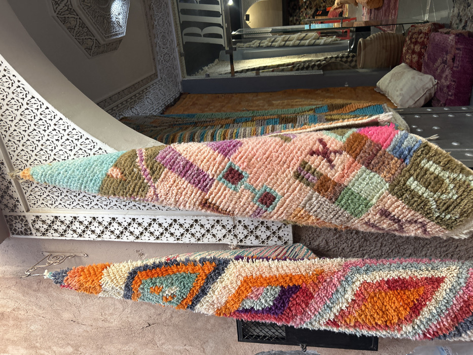 The image displays an exterior view of a retail establishment, likely a rug or textile shop, in Marrakesh, Morocco