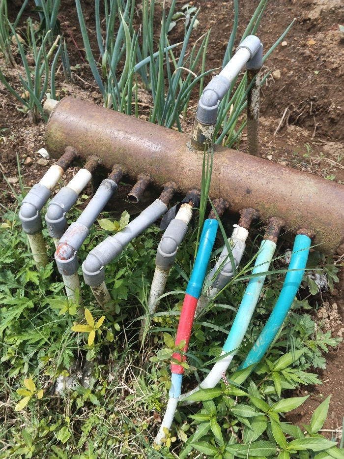 The image displays an agricultural irrigation setup situated in the city of Đăk La, Vietnam. A rusted, cylindrical metal manifold rests horizontally on the ground. Numerous smaller metal pipe outlets protrude from its side; some are open and corroded, while others are fitted with grey PVC elbow connectors leading to white PVC pipes that extend downwards into the surrounding vegetation. One grey PVC pipe with an elbow connector also extends upwards from the top of the manifold. In the lower right, several colorful PVC pipes, including sections of red, blue, and light blue, are visible vertically among the plants, indicative of water distribution lines. The foreground and midground are covered in dense, varied green vegetation, including broad-leafed plants and grasses. In the background, rows of cultivated green plants with long, thin leaves, consistent with green onions, grow in dark brown soil. No individuals are present in the scene.