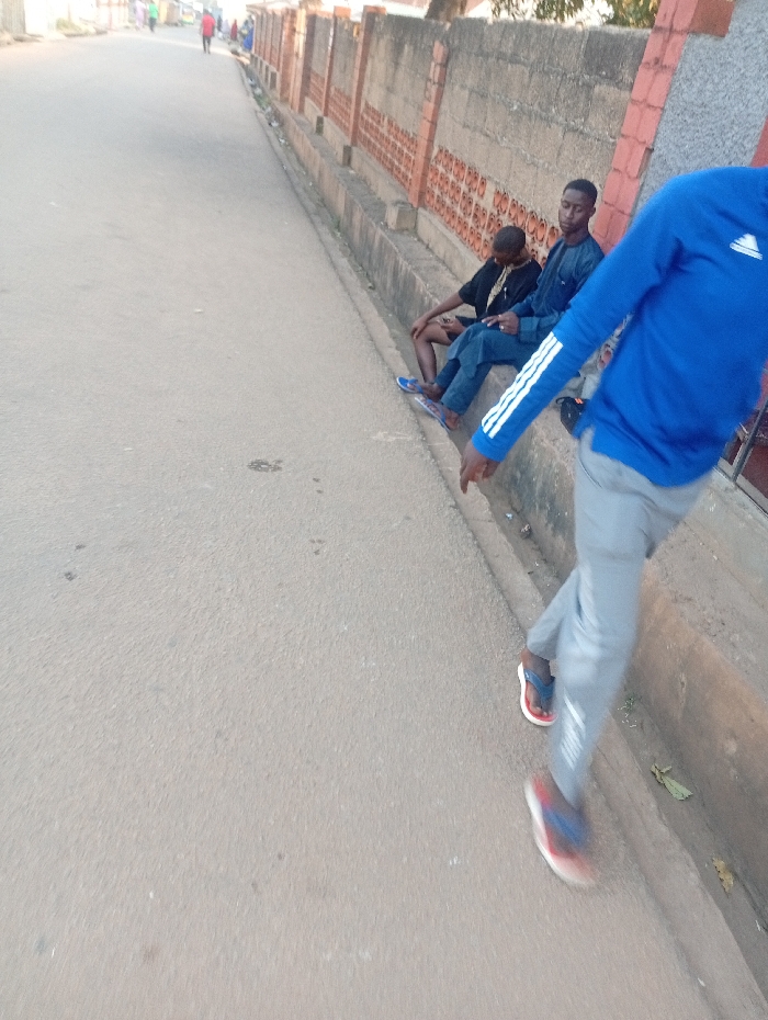 The image depicts an urban street scene in Jos, Nigeria. A paved asphalt road occupies the left side of the frame, extending into the distance where several indistinct figures are visible. Along the right side of the road, a concrete wall with a lower ledge runs parallel, featuring grey concrete blocks interspersed with decorative reddish-brown patterned brick sections. A narrow drainage channel is present between the road and the wall. In the mid-ground, two males are seated on the concrete ledge against the wall. The male on the left wears a black short-sleeved top and dark shorts, with his head slightly bowed. The male on the right wears a dark blue long-sleeved top and dark blue jeans, with blue sandals visible on his feet, looking generally forward. In the immediate foreground on the right, a person is partially captured in motion, blurred. This individual wears a blue long-sleeved shirt with three white stripes on the arm (an Adidas logo is discernible), light grey trousers, a multi-colored sneaker on one foot, and a blue and red sandal on the other. The scene is illuminated by natural daylight.