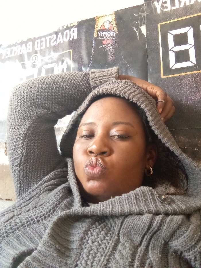 A medium close-up photograph features an individual, likely female, with dark skin, facing the camera. The person is wearing a grey, textured knit hooded sweater with the hood pulled over their head. Their right hand is raised, with fingers partially visible beneath the hood, and a silver ring is present on one finger. The individual's lips are pursed in a "kissing" or "pouting" expression, and their eyes are slightly narrowed. Behind the individual, a dark poster or banner is affixed to a light-colored, possibly weathered, wall. The poster displays inverted text, including "ROASTED BARLEY" and "TROPHY STOUT" with an image of a bottle. A large white number "8" within a black square is also visible on the right side of the poster. The scene is located in Sabon Gari West, Nigeria.