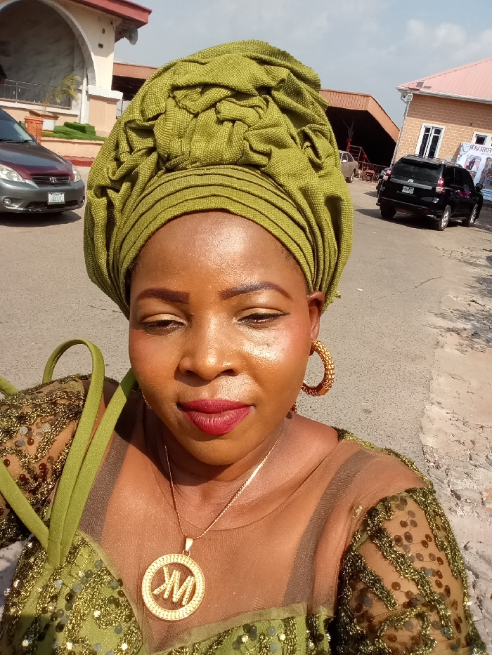 The image presents a close-up, selfie-style portrait of an adult female outdoors on a paved surface in Enugu, Nigeria. The subject, a dark-skinned woman, is positioned slightly off-center, looking downward and to her right. She wears a complex, multi-layered olive-green gèlè (headwrap) and a matching olive-green dress featuring sheer sleeves adorned with sequins. A gold-toned necklace with a circular pendant displaying the letters "MK" is visible, along with a large, textured gold hoop earring on her right ear. Her face is made up with visible foundation, deep red lipstick, golden eyeshadow, and defined eyebrows. The background shows a paved roadway or parking area under a bright, clear sky. To the subject's left, a silver Toyota Sienna minivan with a partially visible Nigerian license plate is parked. Behind the minivan, a building with a large arched entrance and a brown roof is visible. To the subject's right, a black SUV, possibly a Toyota Land Cruiser Prado, is parked further down the road, facing away from the camera. Behind the SUV, a light-colored brick building with a brown roof and white-framed windows is present, partially obscured by a banner. The paved ground exhibits minor cracks and irregularities.