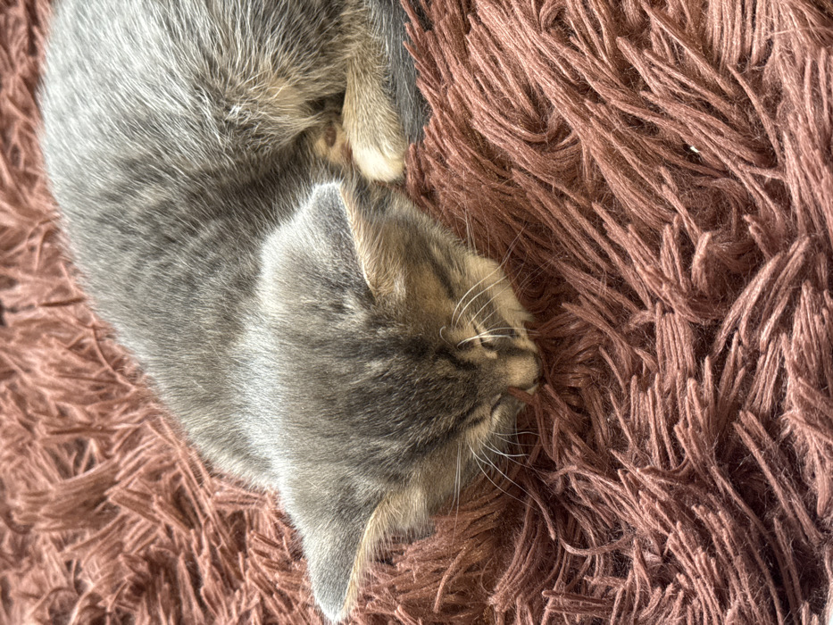- "One juvenile feline, a grey and brown tabby kitten, is depicted sleeping on a shaggy, reddish-brown textile surface" by FM-8yvcf1, licensed under CC BY 4.0