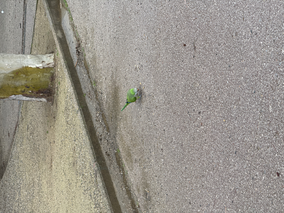 The image displays an outdoor urban environment in L'hospitalet De Llobregat, Spain. A single green Monk Parakeet is visible in the lower center, positioned on a dark grey asphalt surface. The bird, predominantly green with a lighter grey-white face and chest, is leaning forward with its beak near the ground, appearing to forage for small particles. To the left and extending into the upper background, a concrete curb separates the asphalt from a raised area covered with light-colored gravel or sand. The base of a tree with pale, mottled bark is situated in the upper right background, behind the curb. No human figures are present. The lighting is diffused, casting no distinct shadows.