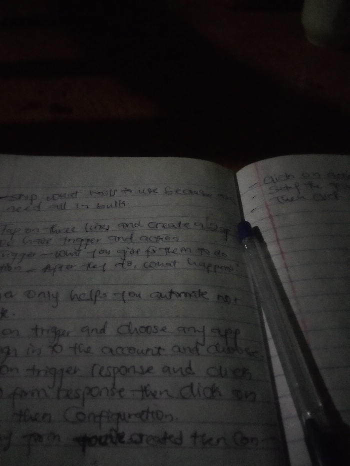 handwritten notes in a notebook. The notes seem to be instructions or explanations related to a software or automation process. Key phrases include "Tap on three lines and create a Zap," "Grave trigger and action," "trigger - what you give for them to do," "we only helps - you automate." Other phrases are "on trigger and choose any app", "on trigger response and clics", "form response then dick on" and "then Configuration". The lighting in the image is dim, making the text somewhat difficult to read. A pen lies across the pages.