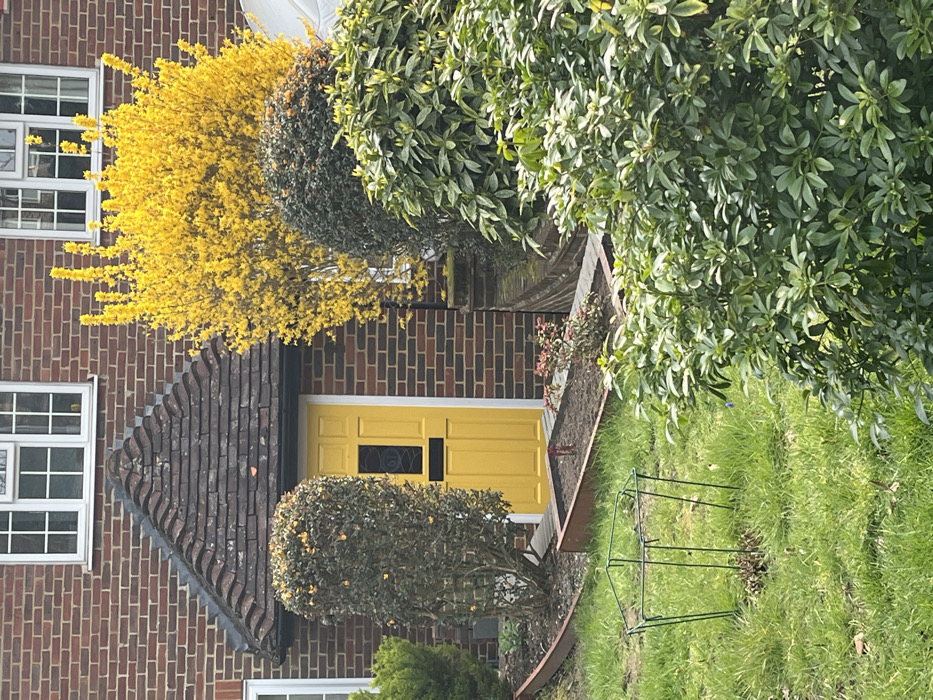 The scene depicts the front exterior of a residential property located in Elmbridge, United Kingdom, observed during daylight. The main structure is a two-story brick house with red-brown brickwork. A bright yellow, paneled front door with a small, dark-paned rectangular window and a black letterbox flap is centrally positioned on the ground floor, framed in white. Above the door is a small, pitched canopy roof covered with dark, weathered clay tiles. Two white-framed, multi-pane windows are visible on the upper floor, with a partial identical window to the left on the ground floor. The foreground and midground feature a cultivated garden. Immediately to the right of the house entrance stands a large, vibrant yellow flowering shrub, consistent with Forsythia, extending upwards past the upper windows. To the left of the door, a tall, slender, dark green shrub, possibly trimmed, is situated within a raised garden bed. Another rectangular raised bed with dark soil and small, reddish-green plant starts is directly in front of the door path. Both raised beds are edged with dark-colored material. A low, curved stone retaining wall is visible to the right of the raised beds. The immediate foreground consists of a lawn with green grass and some sparse areas. A hexagonal green metal wire plant support frame is present on the lawn in the lower-left section. No individuals, animals, or active interactions are present in the frame, indicating a static residential garden scene.