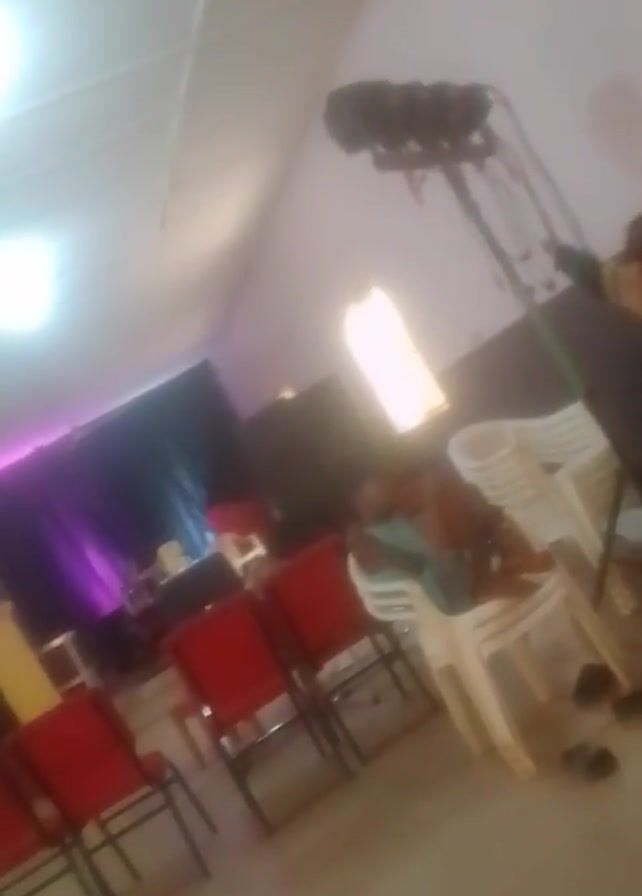n out-of-focus shot of an indoor setting. Red and black chairs are arranged in rows facing a stage-like area with purple lighting. A person is sitting on a white chair near the right side of the frame. Behind them, there is a stand with audio equipment and stacked white chairs. A bright window is visible in the background. The lighting in the room is dim, except for the stage lighting and the window. The overall impression is that the room is being set up or cleaned after an event.