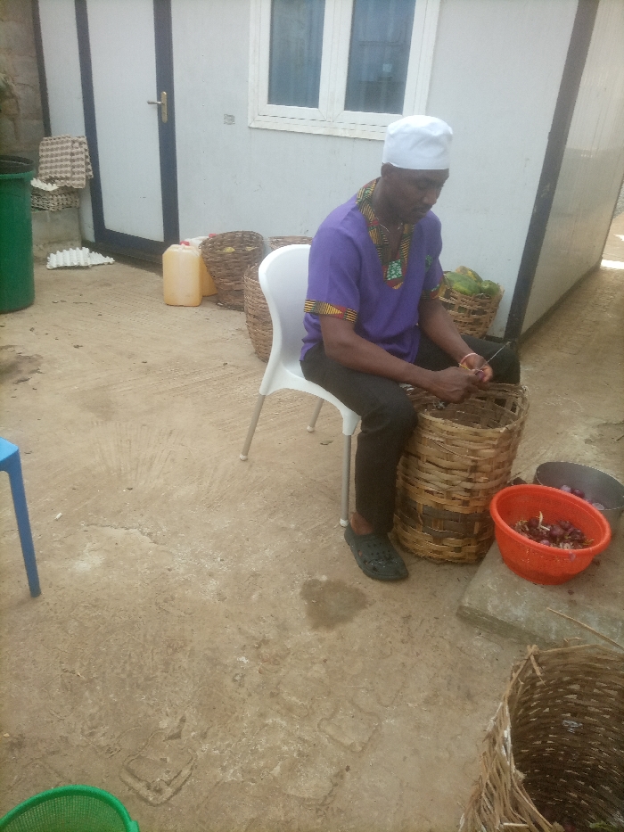 The image depicts an outdoor food preparation area in Opete, Nigeria, during daylight hours. A male individual, wearing a white chef's cap, a purple shirt with patterned trim, dark trousers, and dark Crocs-style sandals, is seated on a white plastic chair. He is actively peeling a small, reddish vegetable, likely an onion, holding it with both hands over a tall, cylindrical woven basket. To his immediate right, a red plastic bowl filled with peeled red onions rests on a concrete block, alongside a silver metal pot containing additional peeled items. The ground is concrete and appears worn. In the background, a light-colored building features a white-framed door on the left and a white-framed window on the right. Various objects are distributed around the scene: * Multiple woven baskets, some containing green produce (possibly papayas), are situated behind the man. * Near the building's door on the left, a green plastic bin, two yellow plastic jerrycans, and several white corrugated egg trays are visible. * A partially visible blue plastic chair is positioned on the far left. * Another woven basket is partially visible in the lower right foreground.