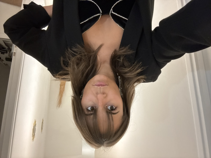 A woman poses for a selfie, angled downwards. She has brown hair with bangs and wears a black blazer over a black top with a diamond-shaped neckline. Dangling earrings are visible. The background shows a white wall with decorative elements, including small, sunburst-shaped mirrors. The lighting is dim, creating soft shadows.