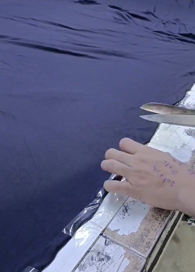 A pair of hands is shown cutting a large piece of navy-blue fabric with a pair of black and silver scissors. The fabric is laid out on what appears to be a large, tiled table. There is clear plastic on the edge of the table. The person cutting the fabric is wearing a gray t-shirt. The hands have some writing on them. In the background, more of the same fabric is draped. The background is out of focus. The action consists of cutting the fabric. The environment is a large room with a tiled table. The setting appears to be a workshop or factory.
