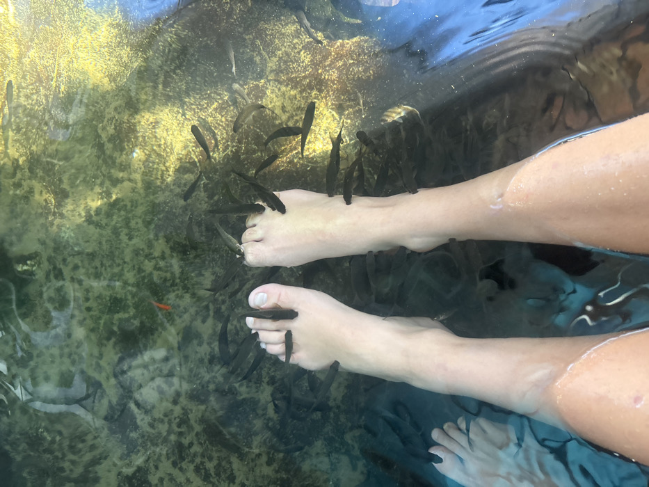 Two pairs of bare feet are submerged in clear water, surrounded by small, dark fish. The fish cluster around and nibble at the skin of the feet. Light reflecting off the water creates shimmering patterns. An orange fish is seen near the water floor, in the distance, some legs and bare feet are partially visible in the water. The water's bottom shows a mix of green and brown algae and some rock.