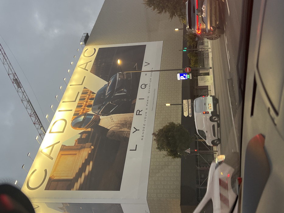 The image captures a street view from inside a vehicle in Neuilly-sur-Seine, France, during overcast or dusk conditions. A large building dominates the background, featuring an expansive, illuminated billboard advertising "CADILLAC LYRIQ." The billboard's graphic displays a person wearing a full-face helmet positioned next to a dark Cadillac Lyriq vehicle, with classical architectural elements in the background. Subtext on the billboard reads "RENDEZ-VOUS À PARIS. QUARTIER OPERA." A construction crane extends into the gray sky above the building. The lower facade of the building exhibits a patterned design, with metal barriers positioned along its base. On the multi-lane road in the mid-ground, a white commercial van moves from left to right. A dark gray SUV, bearing the French license plate "GT-909-NV," is stationary in the right lane, facing away from the viewer, with its taillights illuminated. A partially visible white vehicle with red and white striped reflective markings is in the extreme left foreground. Street furniture includes a directional sign indicating "NEUILLY HÔTEL de VILLE" and "P. Ch. De Gaulle," a blue parking sign displaying a Euro symbol, and a red circular traffic sign. A green traffic light is visible on the right, while a red traffic light is partially obscured on the left. Two streetlights emit yellow illumination. A small tree stands near the sidewalk. The foreground shows a partial view of a vehicle's dashboard.