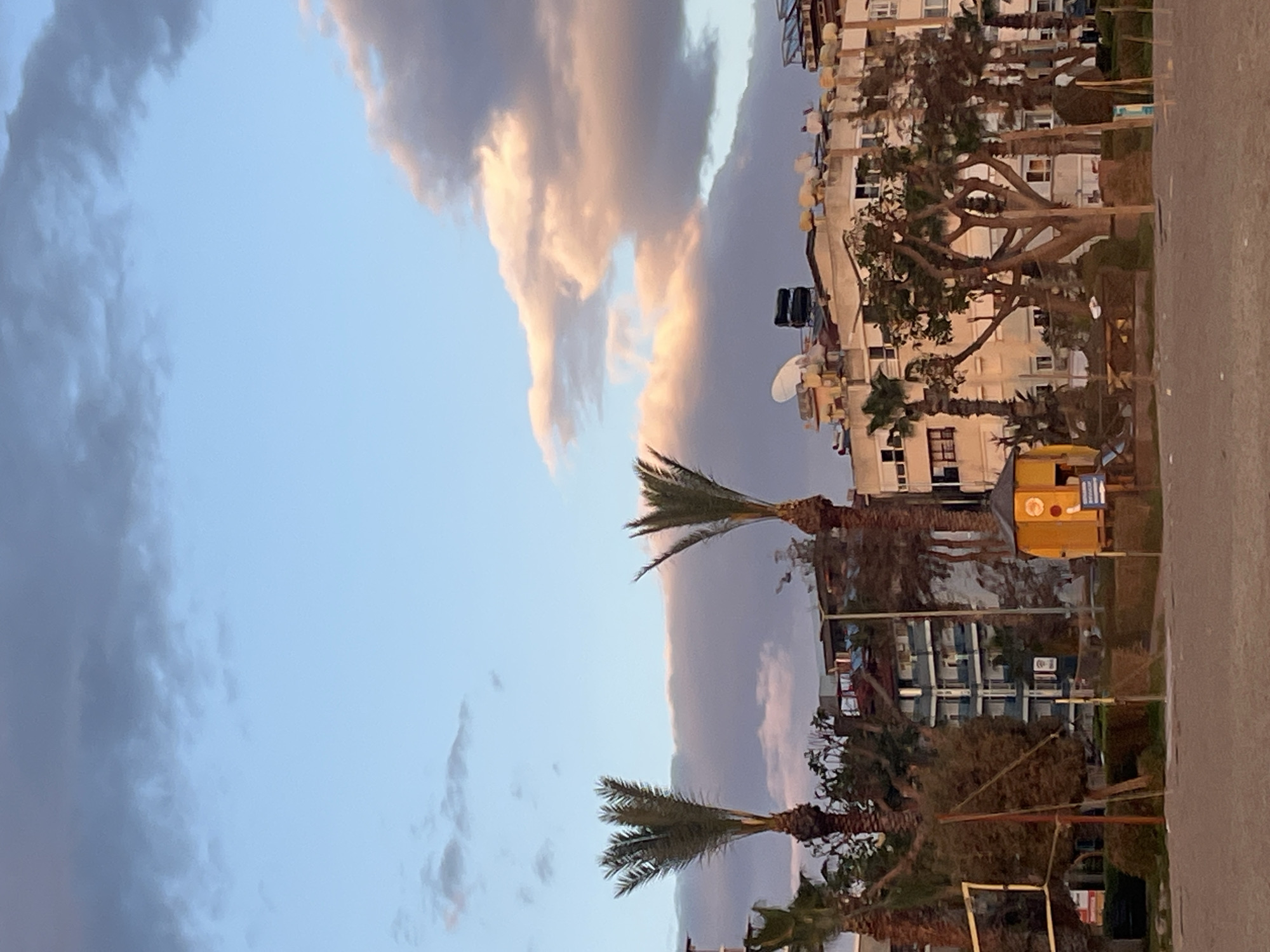 view from a street in Alanya, Turkey. The sky is partially cloudy, with a mix of blue sky and gray clouds tinged with pink from the sunset. Palm trees line the street on one side, interspersed with deciduous trees. Buildings are visible behind the trees, including what appear to be residential apartments. A yellow mailbox or electrical box stands on the sidewalk. The street appears to be paved and is visible in the foreground. A satellite dish is mounted on one of the buildings.