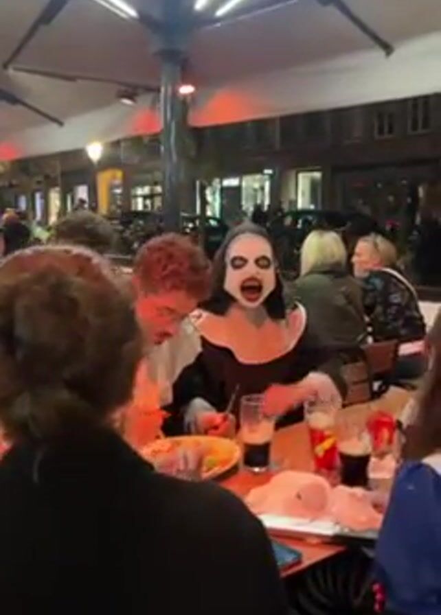 A group of people is gathered around a red table under an umbrella-like structure with bright lights. Most are dressed casually, but one person is dressed as a scary nun with white face paint and a black and white habit. She waves at the camera. Food and drinks are on the table, suggesting a meal or gathering. The scene appears to be outdoors, possibly a patio or public area with buildings visible in the background.